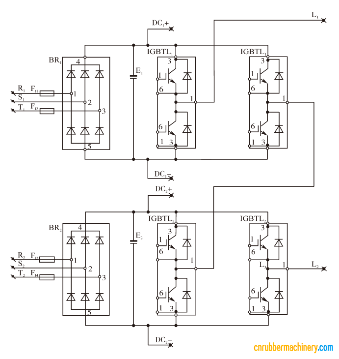 图2 中,R1,S1,T1,R2,S2,T2为功率单元的6 相输入端,线电压为690 V,L1和L2为功率单元的输出端,输出电压为1 450 V。通过计算,功率单元